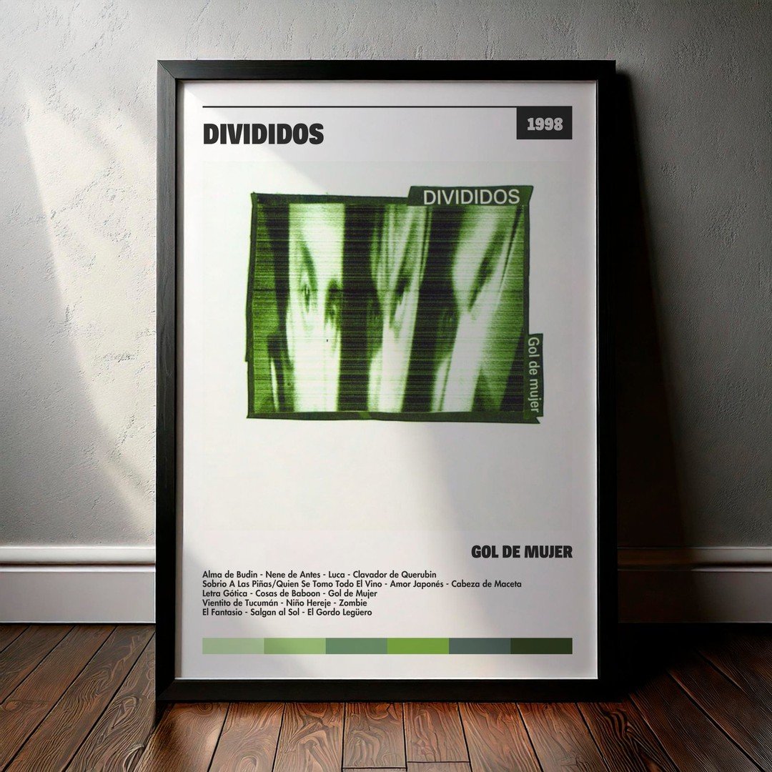 Nuestra colección de cuadros de Divididos captura la esencia de sus álbumes más icónicos, presentados en un elegante estilo, en este caso te presentamos el de su disco Gol De Mujer.