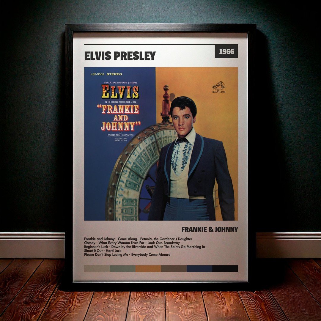 Nuestra colección de cuadros de Elvis Presley captura la esencia de sus álbumes más icónicos, presentados en un elegante estilo, en este caso te presentamos el de su disco Frankie & Johnny.