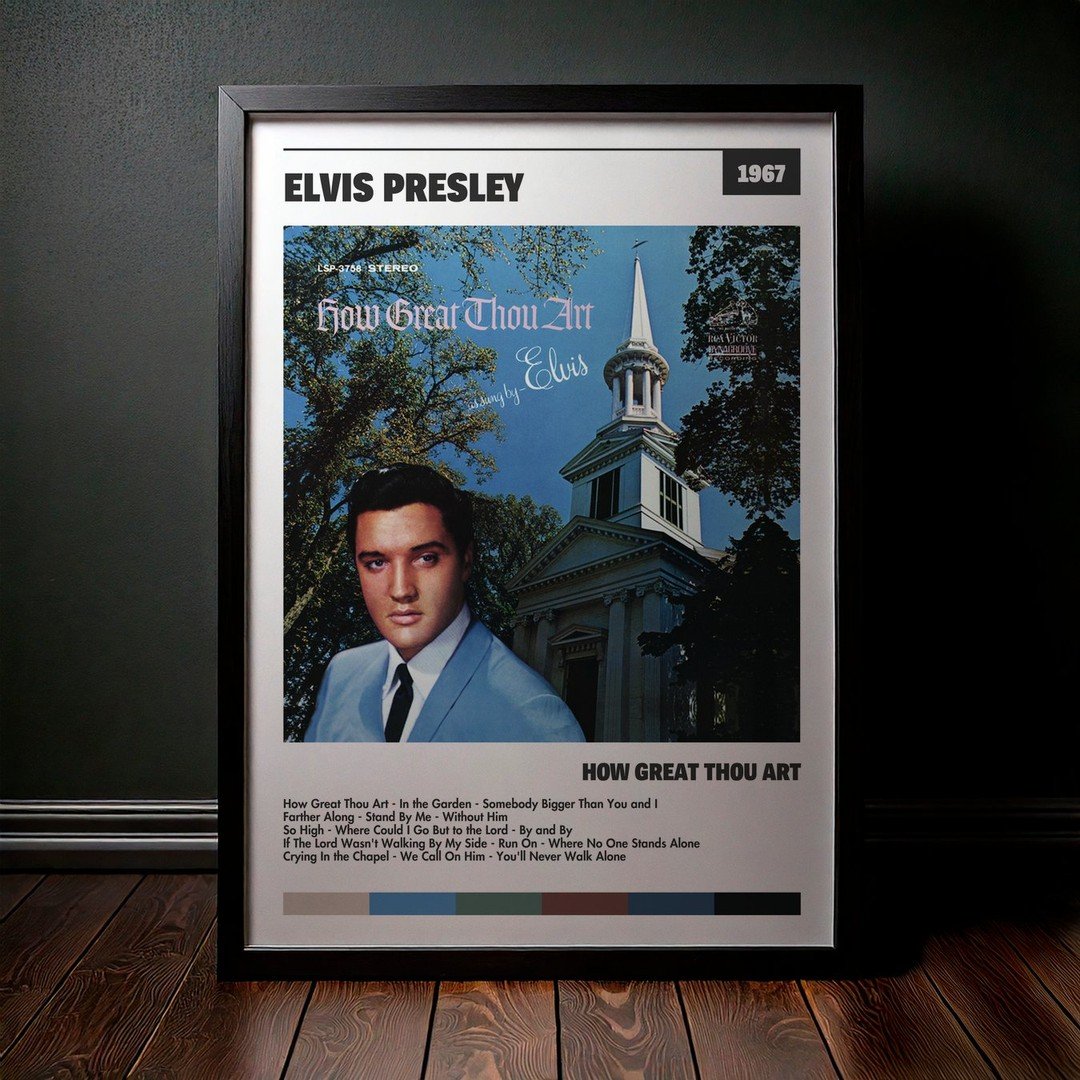 Nuestra colección de cuadros de Elvis Presley captura la esencia de sus álbumes más icónicos, presentados en un elegante estilo, en este caso te presentamos el de su disco How Great Thou Art.