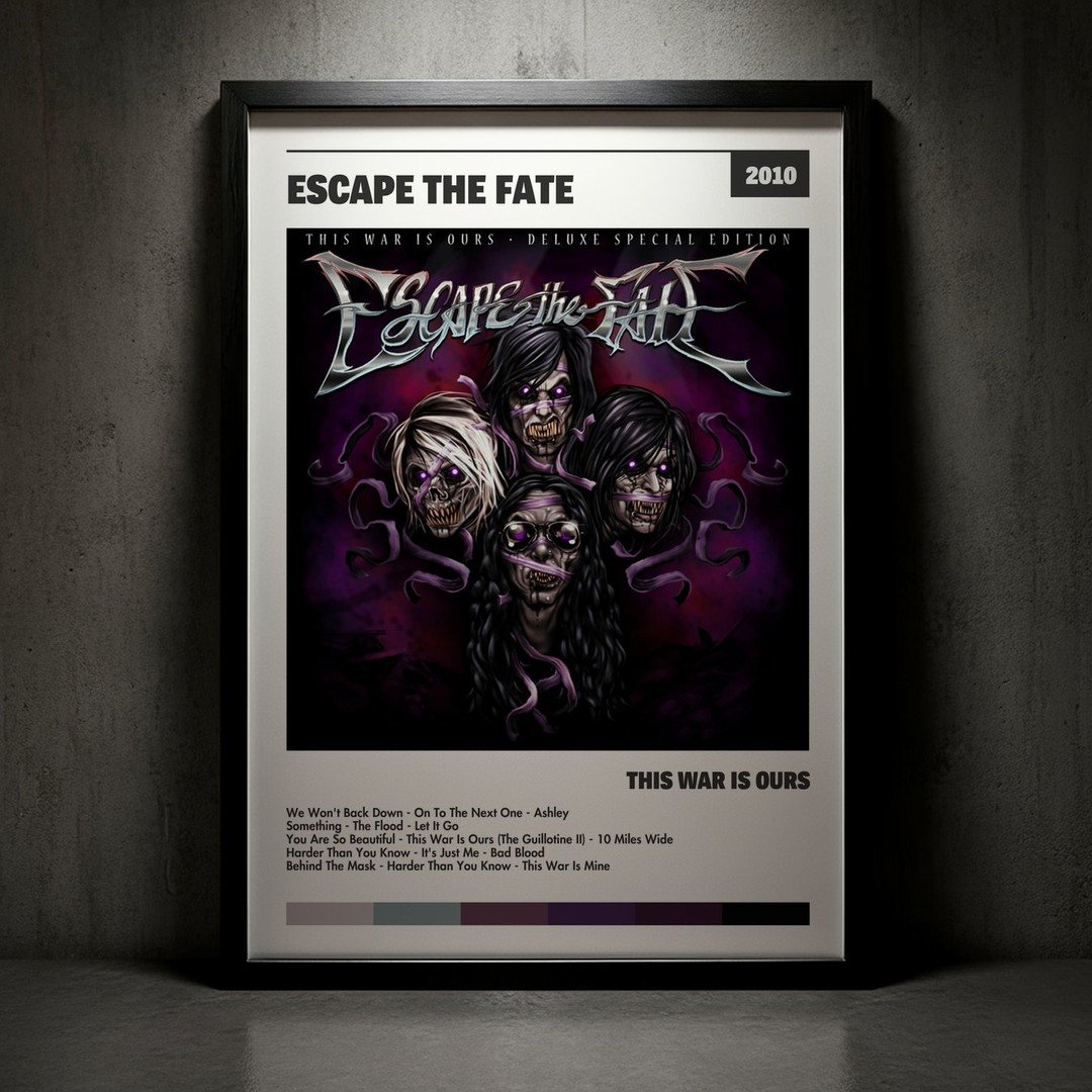 Nuestra colección de cuadros de Escape the Fate captura la esencia de sus álbumes más icónicos, presentados en un elegante estilo, en este caso te presentamos el de su disco This War Is Ours.