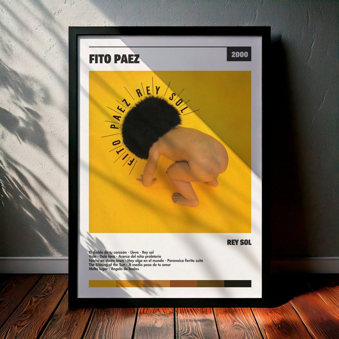 Nuestra colección de cuadros de Fito Paez captura la esencia de sus álbumes más icónicos, presentados en un elegante estilo, en este caso te presentamos el de su disco Rey Sol.