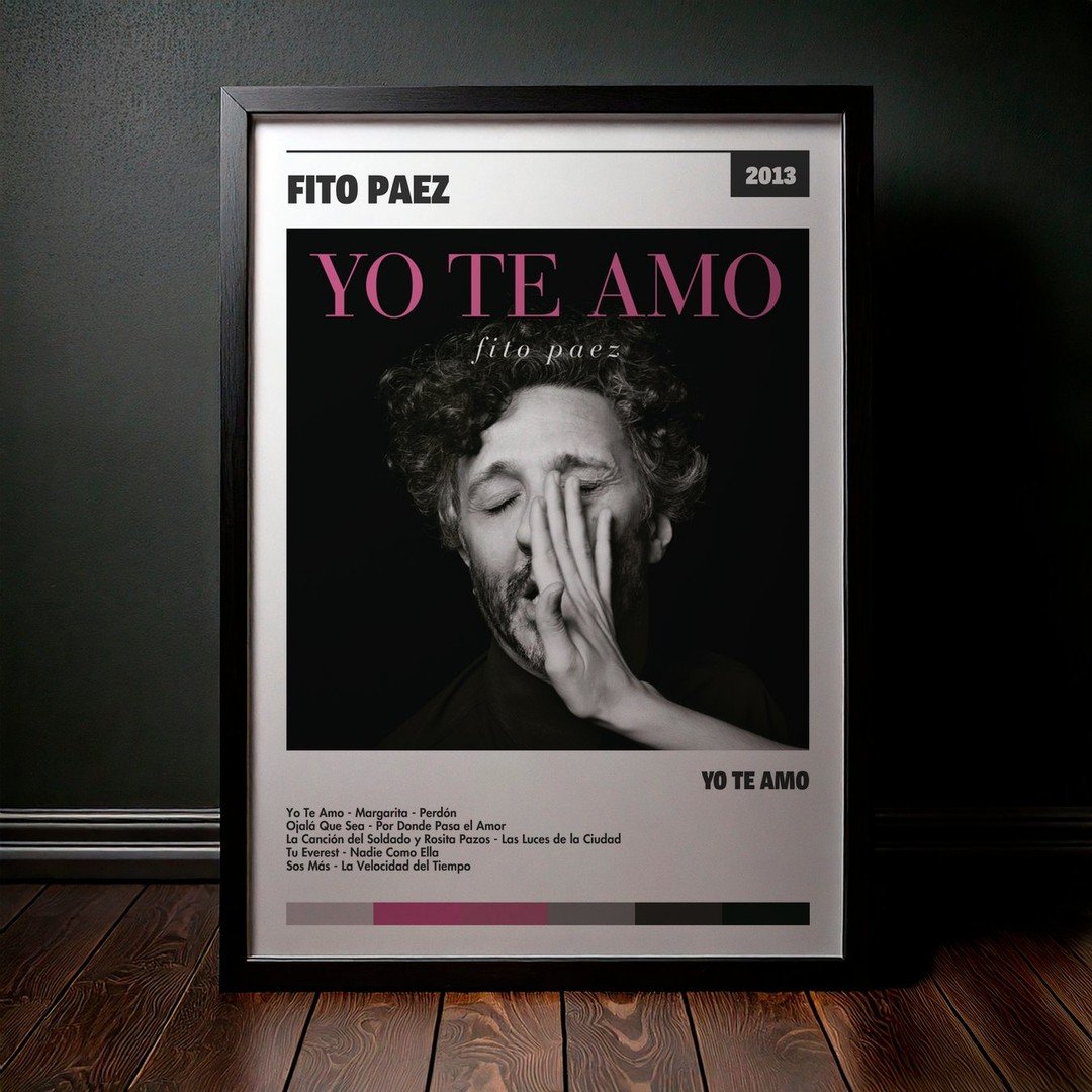 Nuestra colección de cuadros de Fito Paez captura la esencia de sus álbumes más icónicos, presentados en un elegante estilo, en este caso te presentamos el de su disco Yo Te Amo.