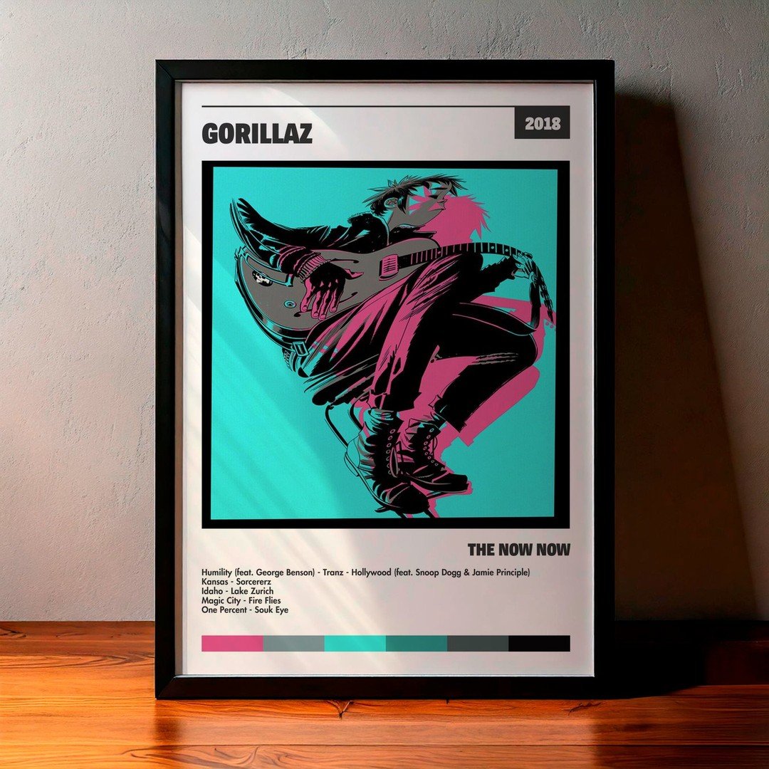 Nuestra colección de cuadros de Gorillaz captura la esencia de sus álbumes más icónicos, presentados en un elegante estilo, en este caso te presentamos el de su disco The Now Now.