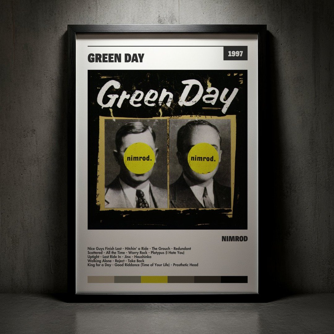 Nuestra colección de cuadros de Green Day captura la esencia de sus álbumes más icónicos, presentados en un elegante estilo, en este caso te presentamos el de su disco Nimrod.