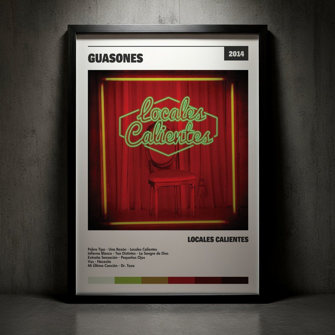Nuestra colección de cuadros de Guasones captura la esencia de sus álbumes más icónicos, presentados en un elegante estilo, en este caso te presentamos el de su disco Locales Calientes.