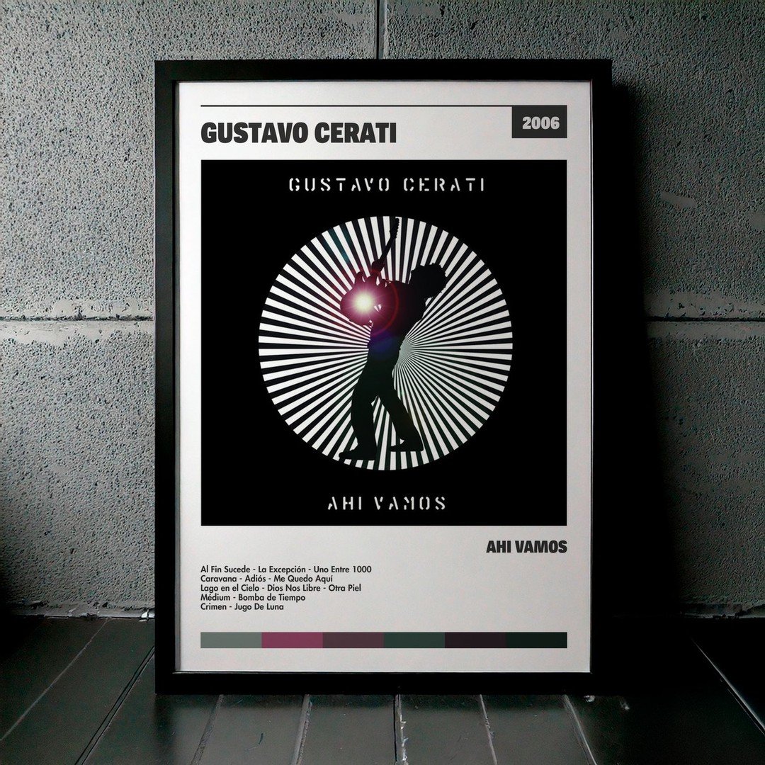 Nuestra colección de cuadros de Gustavo Cerati captura la esencia de sus álbumes más icónicos, presentados en un elegante estilo, en este caso te presentamos el de su disco Ahí Vamos.