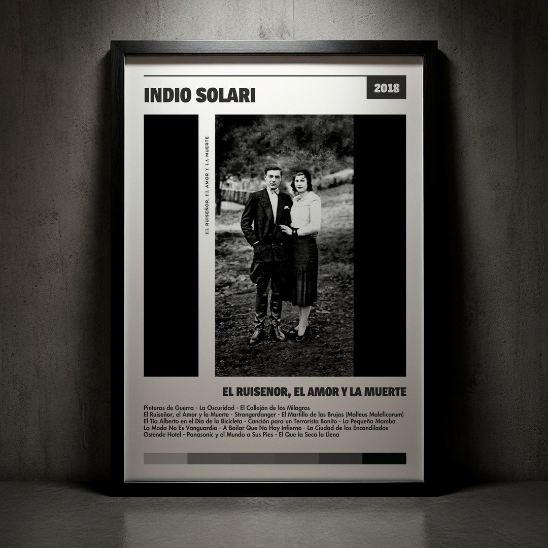 Nuestra colección de cuadros de Indio Solari captura la esencia de sus álbumes más icónicos, presentados en un elegante estilo, en este caso te presentamos el de su disco El Ruiseñor, el Amor y la Muerte.