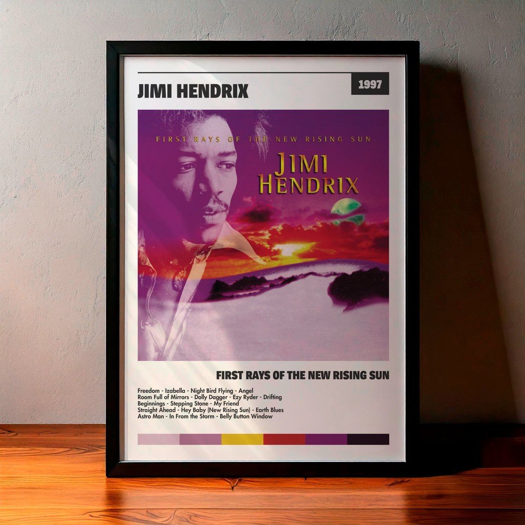 Nuestra colección de cuadros de Jimi Hendrix captura la esencia de sus álbumes más icónicos, presentados en un elegante estilo, en este caso te presentamos el de su disco First Rays Of The New Rising Sun.