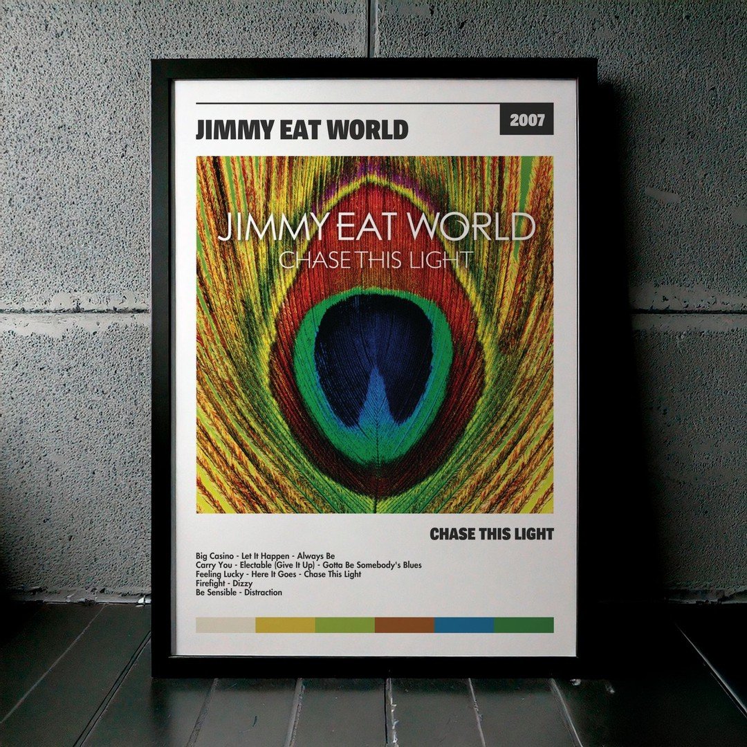 Nuestra colección de cuadros de Jimmy Eat World captura la esencia de sus álbumes más icónicos, presentados en un elegante estilo, en este caso te presentamos el de su disco Chase This Light.