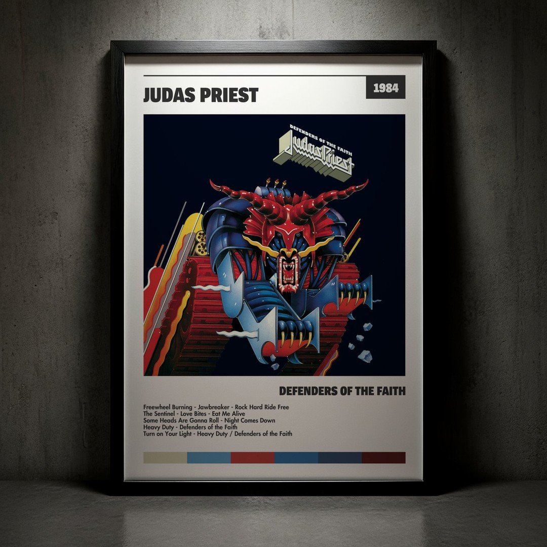 • Diseño Exclusivo: Cuadro de alta calidad basado en la portada del álbum Defenders Of The Faith de Judas Priest.