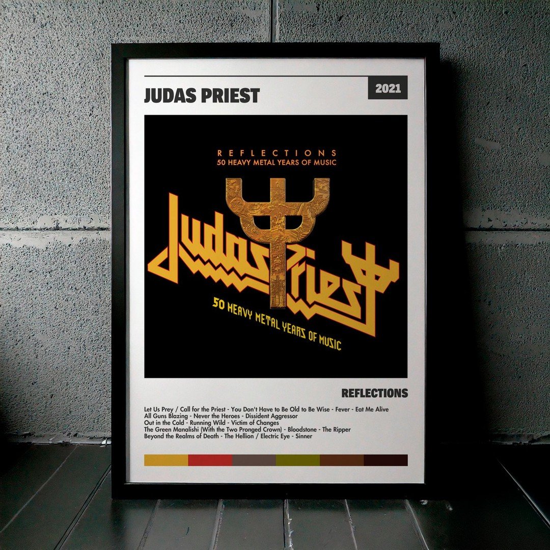 Nuestra colección de cuadros de Judas Priest captura la esencia de sus álbumes más icónicos, presentados en un elegante estilo, en este caso te presentamos el de su disco Reflections.