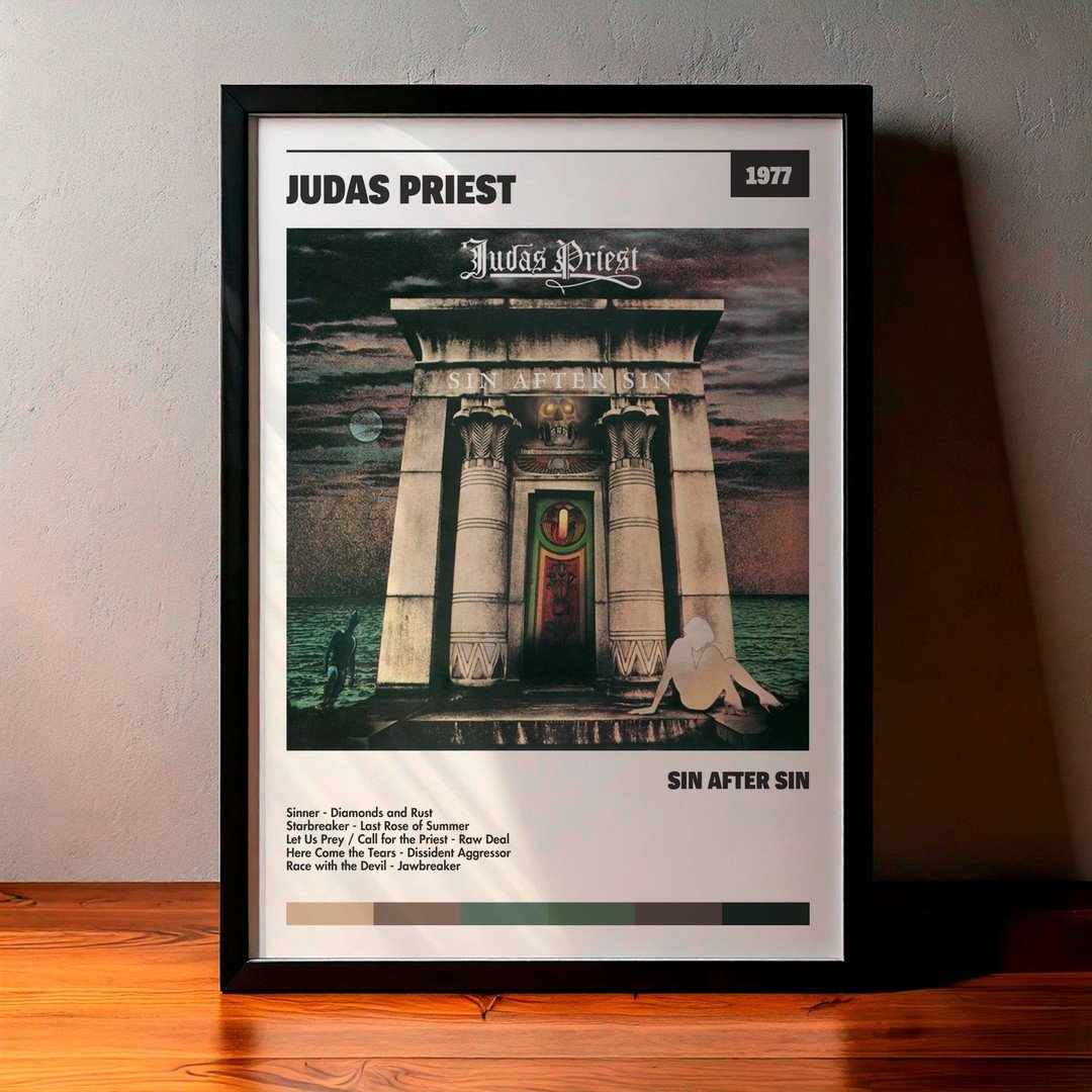 Nuestra colección de cuadros de Judas Priest captura la esencia de sus álbumes más icónicos, presentados en un elegante estilo, en este caso te presentamos el de su disco Sin After Sin.