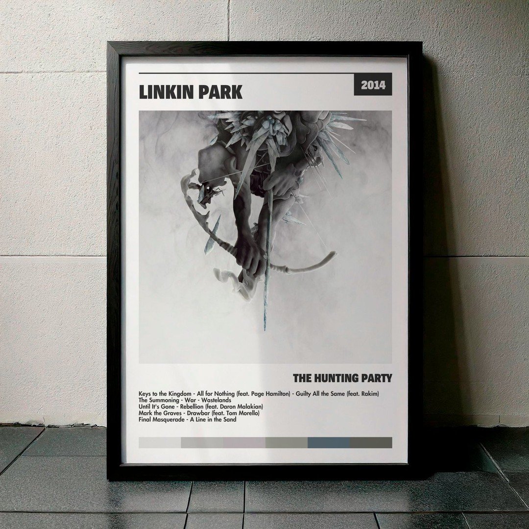 Nuestra colección de cuadros de Linkin Park captura la esencia de sus álbumes más icónicos, presentados en un elegante estilo, en este caso te presentamos el de su disco The Hunting Party.