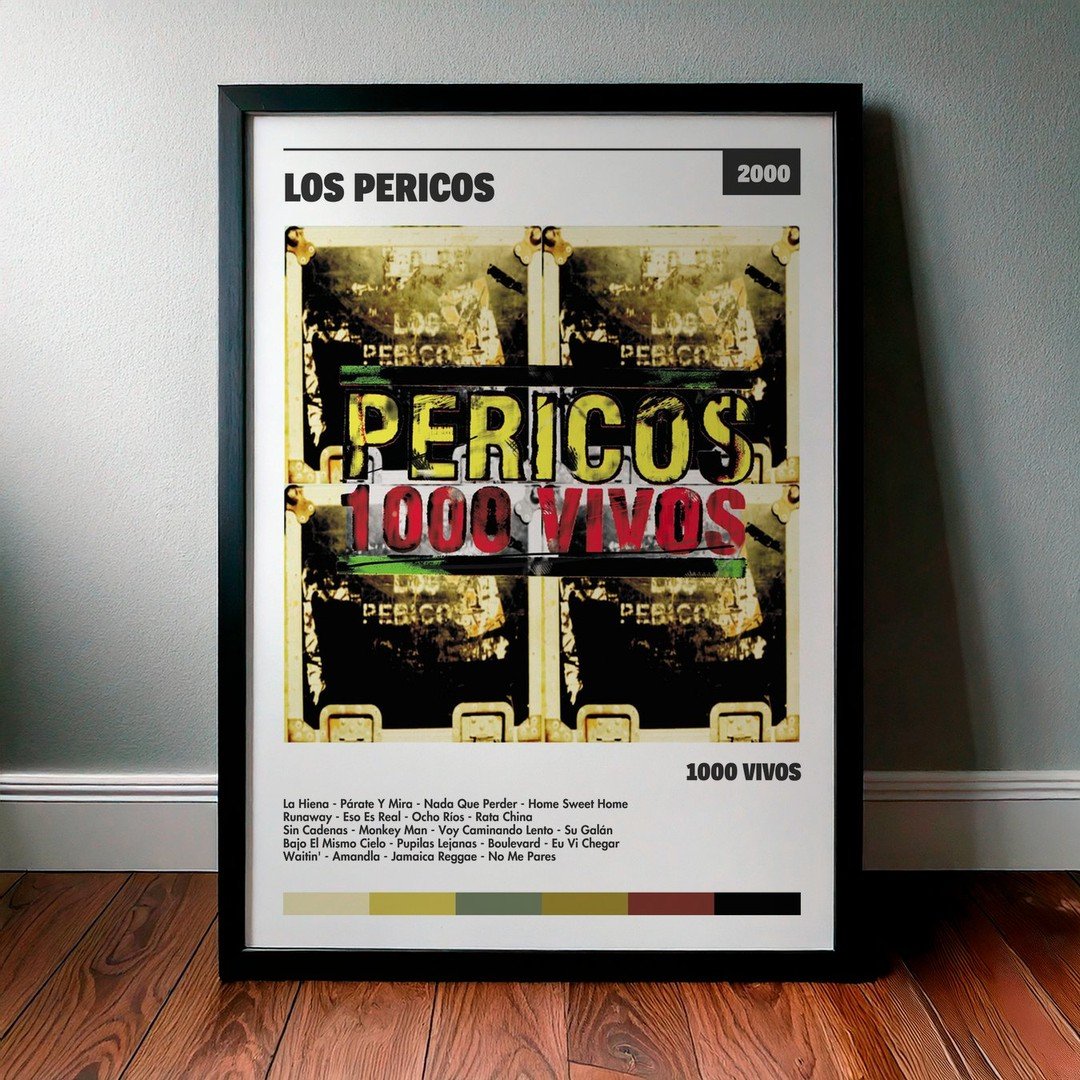 Nuestra colección de cuadros de Los Pericos captura la esencia de sus álbumes más icónicos, presentados en un elegante estilo, en este caso te presentamos el de su disco 1000 Vivos.