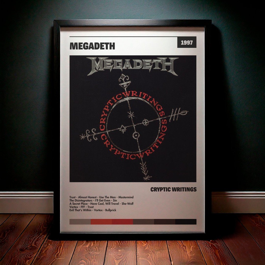 Nuestra colección de cuadros de Megadeth captura la esencia de sus álbumes más icónicos, presentados en un elegante estilo, en este caso te presentamos el de su disco Cryptic Writings.