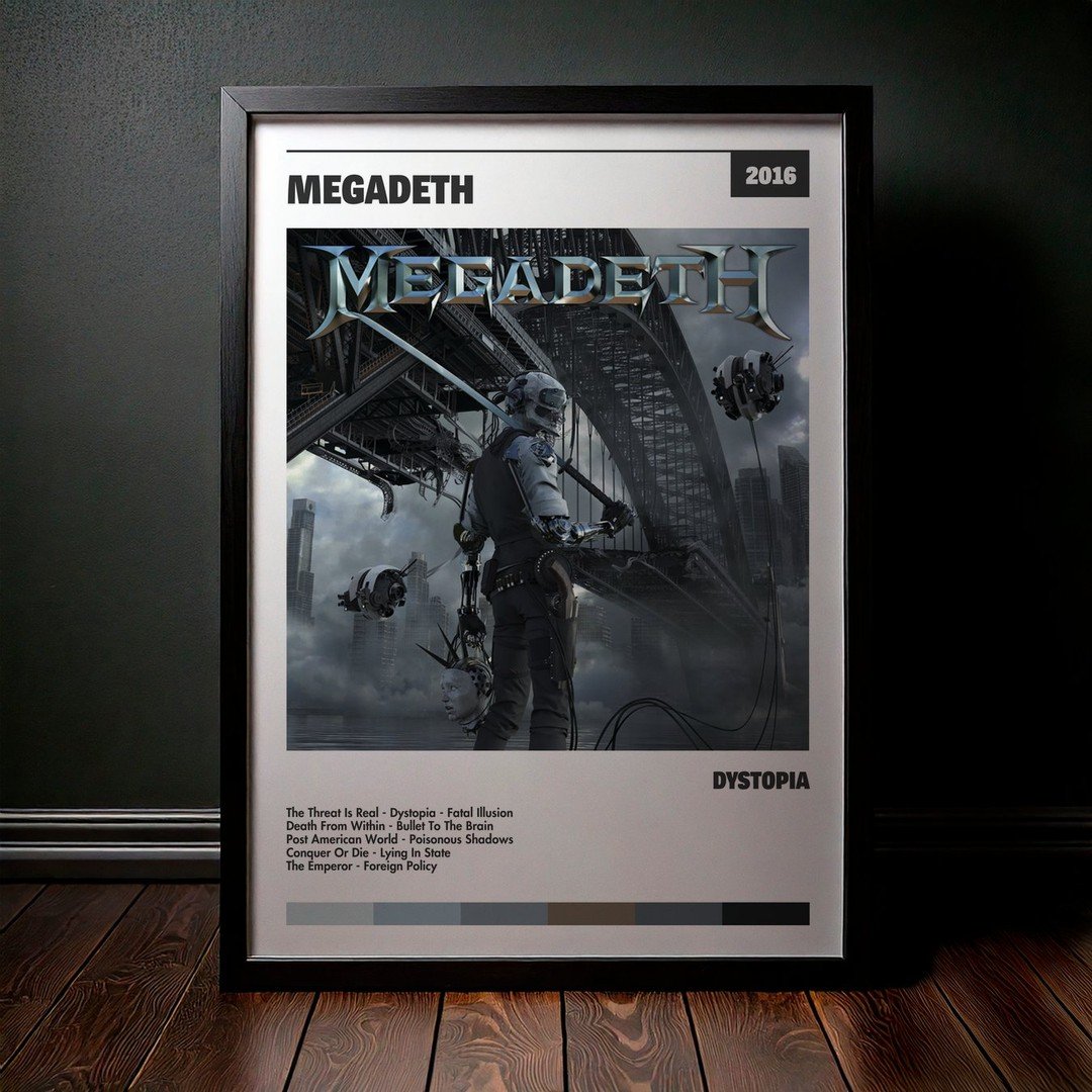 Nuestra colección de cuadros de Megadeth captura la esencia de sus álbumes más icónicos, presentados en un elegante estilo, en este caso te presentamos el de su disco Dystopia.