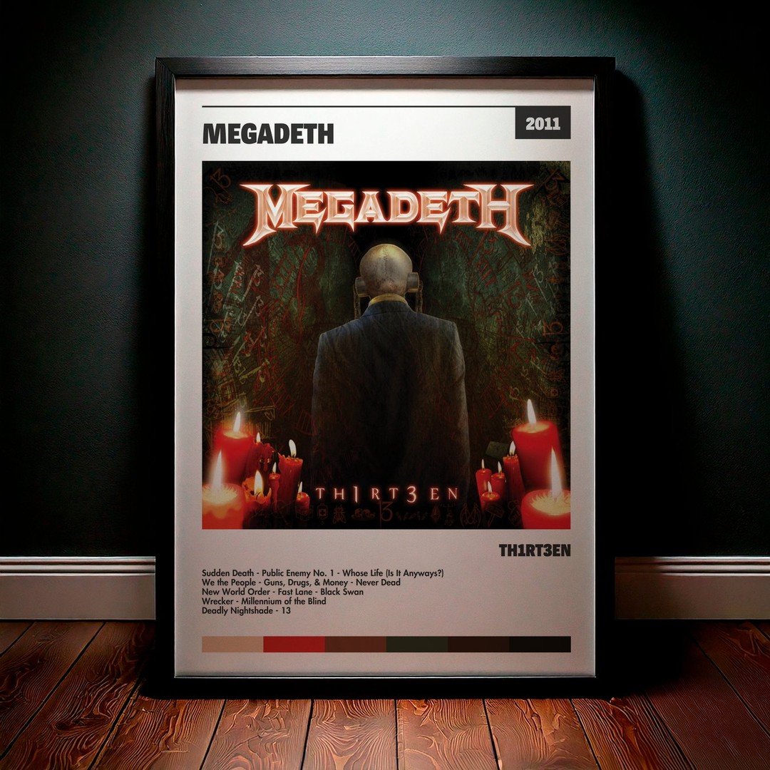 Nuestra colección de cuadros de Megadeth captura la esencia de sus álbumes más icónicos, presentados en un elegante estilo, en este caso te presentamos el de su disco Th1rt3en.