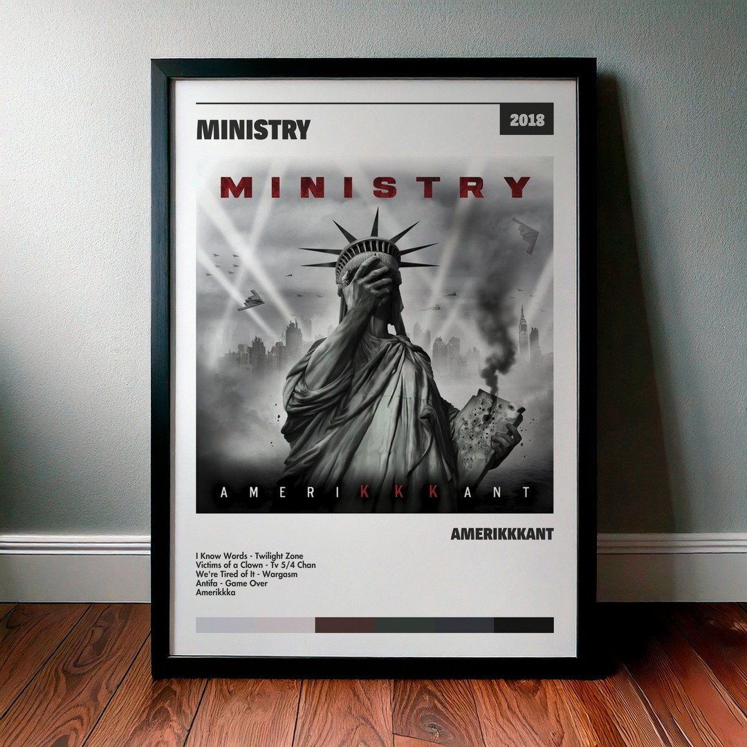 Nuestra colección de cuadros de Ministry captura la esencia de sus álbumes más icónicos, presentados en un elegante estilo, en este caso te presentamos el de su disco Amerikkkant.