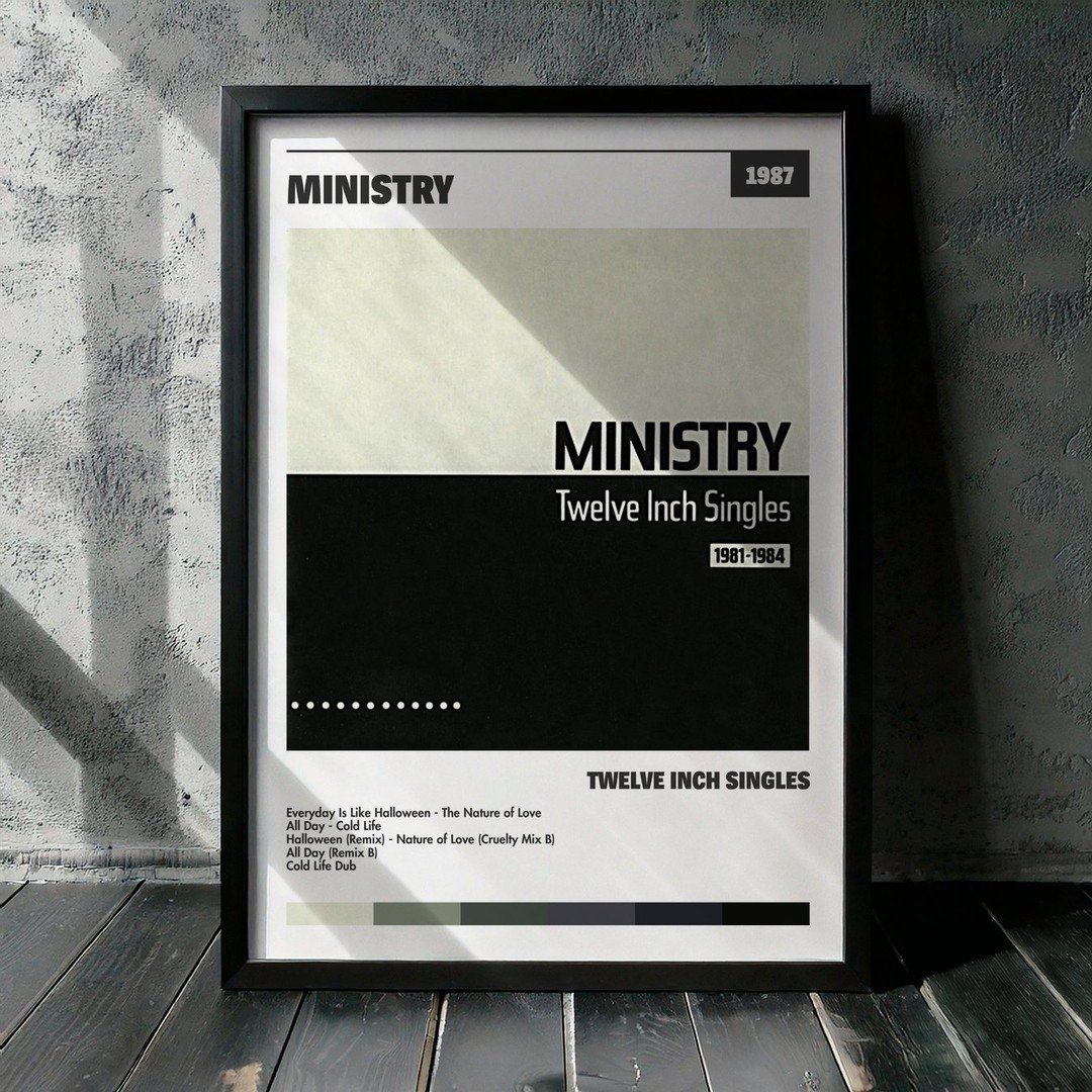 Nuestra colección de cuadros de Ministry captura la esencia de sus álbumes más icónicos, presentados en un elegante estilo, en este caso te presentamos el de su disco Twelve Inch Singles.