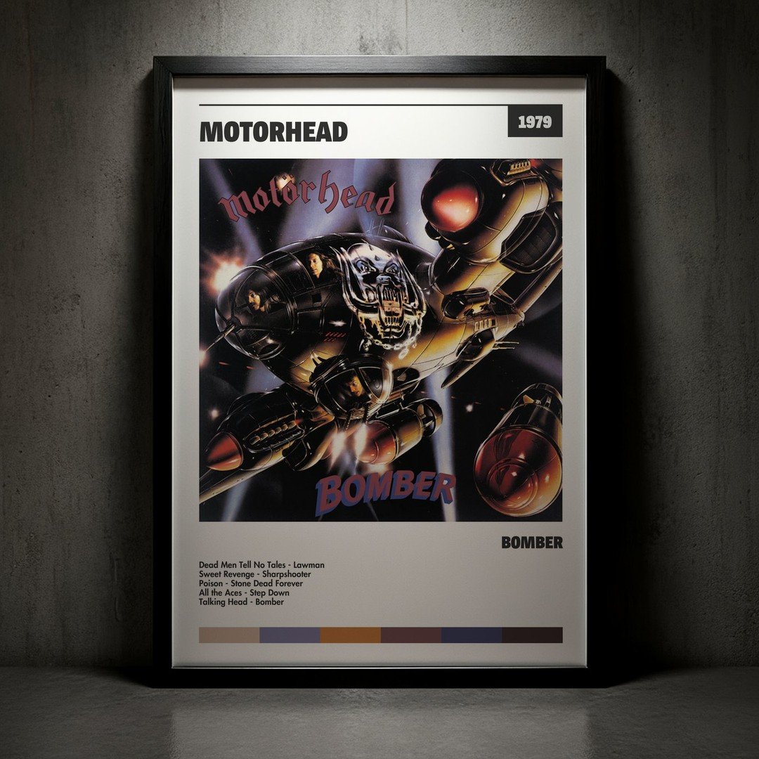 Nuestra colección de cuadros de Motörhead captura la esencia de sus álbumes más icónicos, presentados en un elegante estilo, en este caso te presentamos el de su disco Bomber.