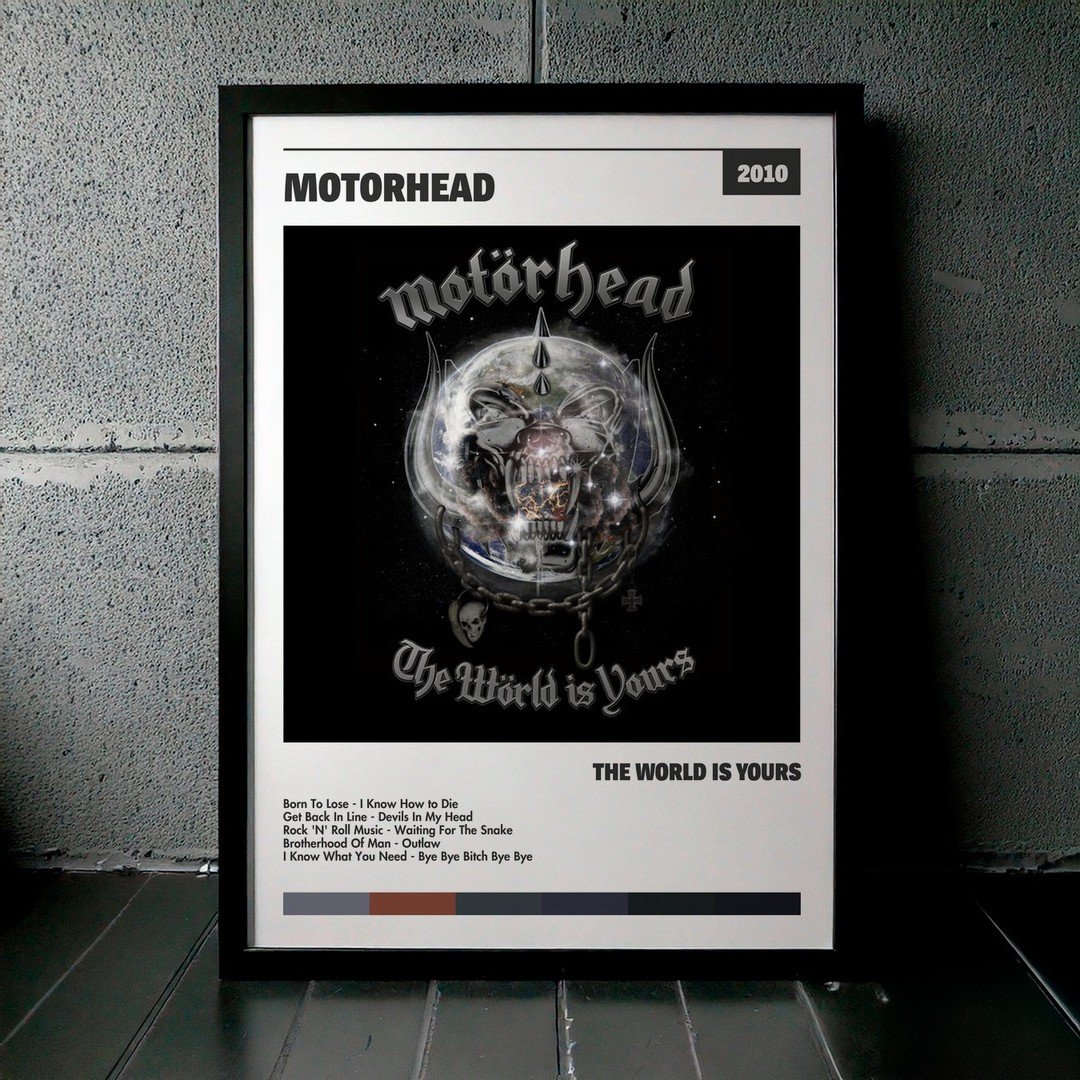 Nuestra colección de cuadros de Motörhead captura la esencia de sus álbumes más icónicos, presentados en un elegante estilo, en este caso te presentamos el de su disco The World Is Yours.
