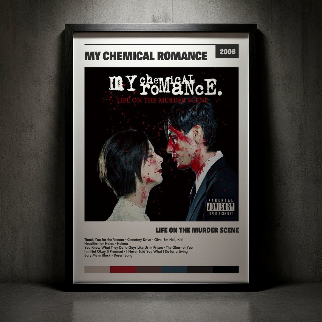 Nuestra colección de cuadros de My Chemical Romance captura la esencia de sus álbumes más icónicos, presentados en un elegante estilo, en este caso te presentamos el de su disco Life on the Murder Scene.