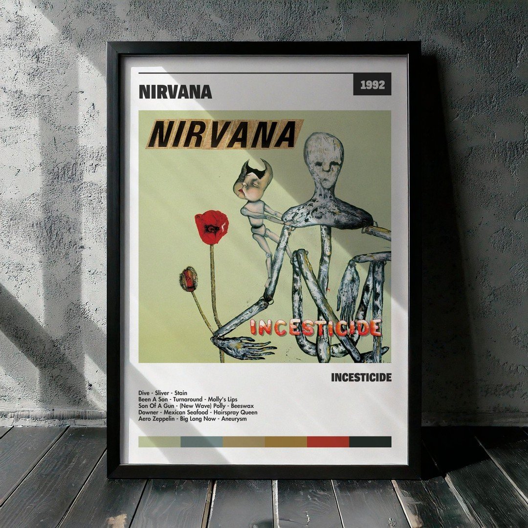 Nuestra colección de cuadros de Nirvana captura la esencia de sus álbumes más icónicos, presentados en un elegante estilo, en este caso te presentamos el de su disco Incesticide.