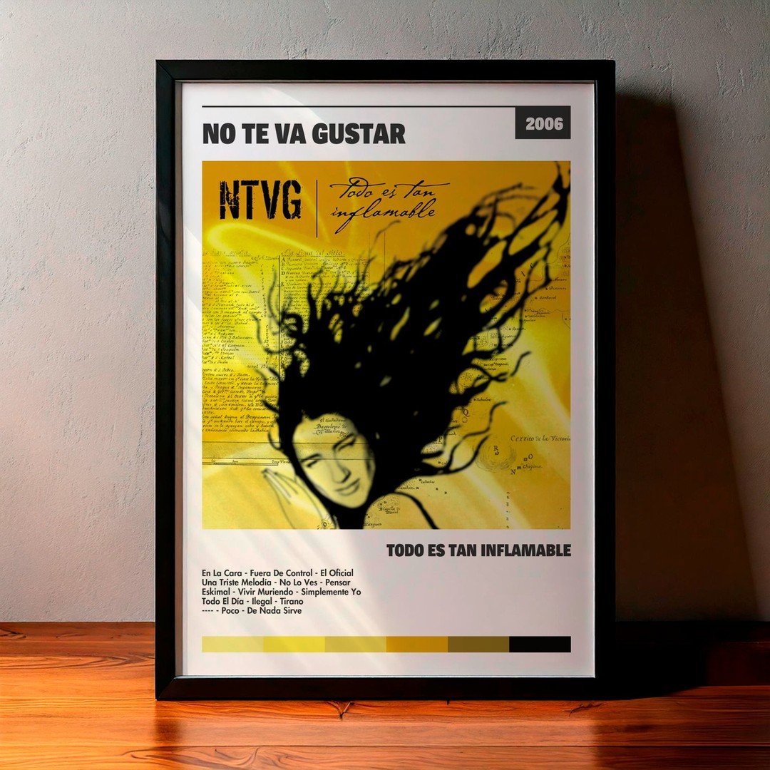 Nuestra colección de cuadros de No Te Va Gustar captura la esencia de sus álbumes más icónicos, presentados en un elegante estilo, en este caso te presentamos el de su disco Todo es tan inflamable.