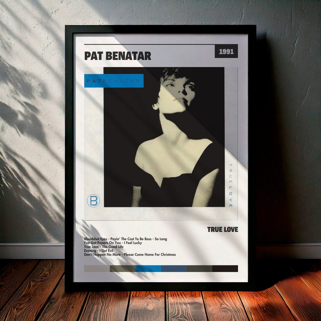 Nuestra colección de cuadros de Pat Benatar captura la esencia de sus álbumes más icónicos, presentados en un elegante estilo, en este caso te presentamos el de su disco True Love.