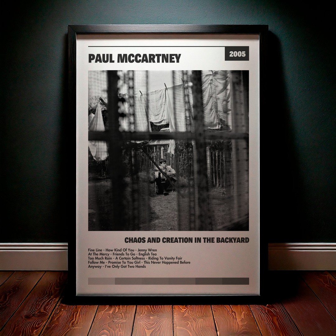 Nuestra colección de cuadros de Paul McCartney captura la esencia de sus álbumes más icónicos, presentados en un elegante estilo, en este caso te presentamos el de su disco Chaos And Creation In The Backyard.