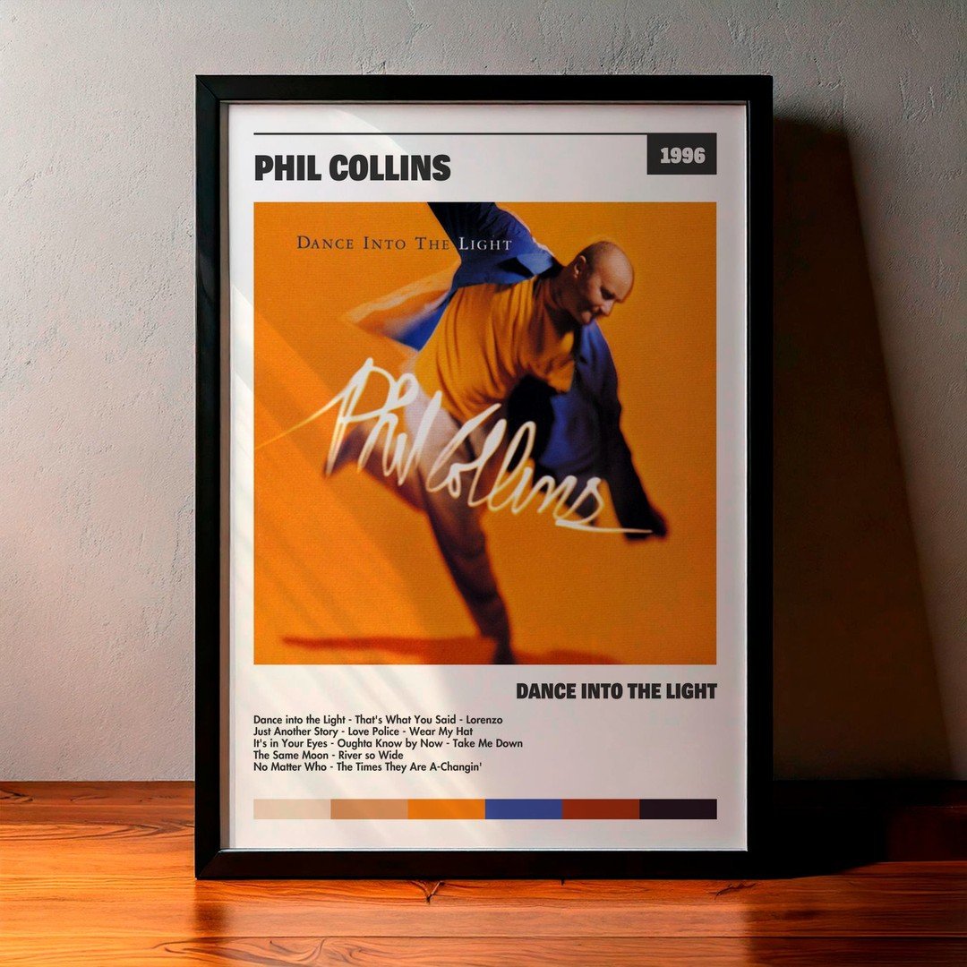 Nuestra colección de cuadros de Phil Collins captura la esencia de sus álbumes más icónicos, presentados en un elegante estilo, en este caso te presentamos el de su disco Dance into the Light.