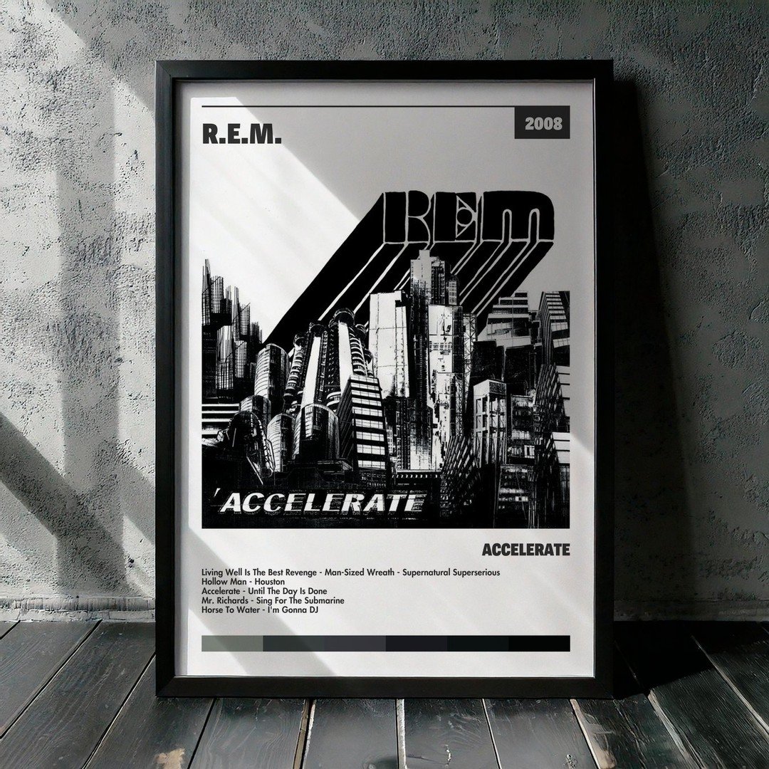 Nuestra colección de cuadros de R.E.M. captura la esencia de sus álbumes más icónicos, presentados en un elegante estilo, en este caso te presentamos el de su disco Accelerate.