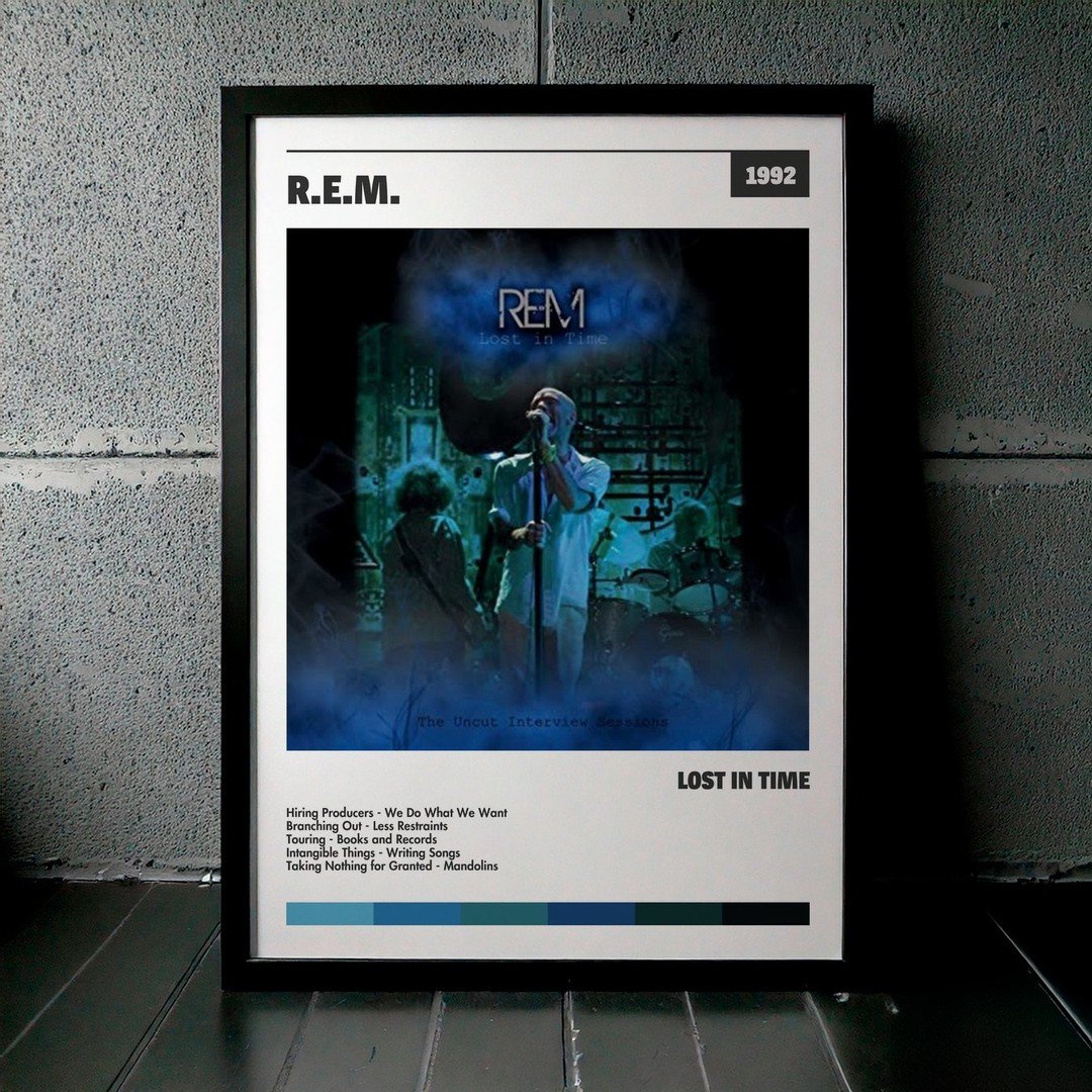 Nuestra colección de cuadros de R.E.M. captura la esencia de sus álbumes más icónicos, presentados en un elegante estilo, en este caso te presentamos el de su disco Lost in Time.