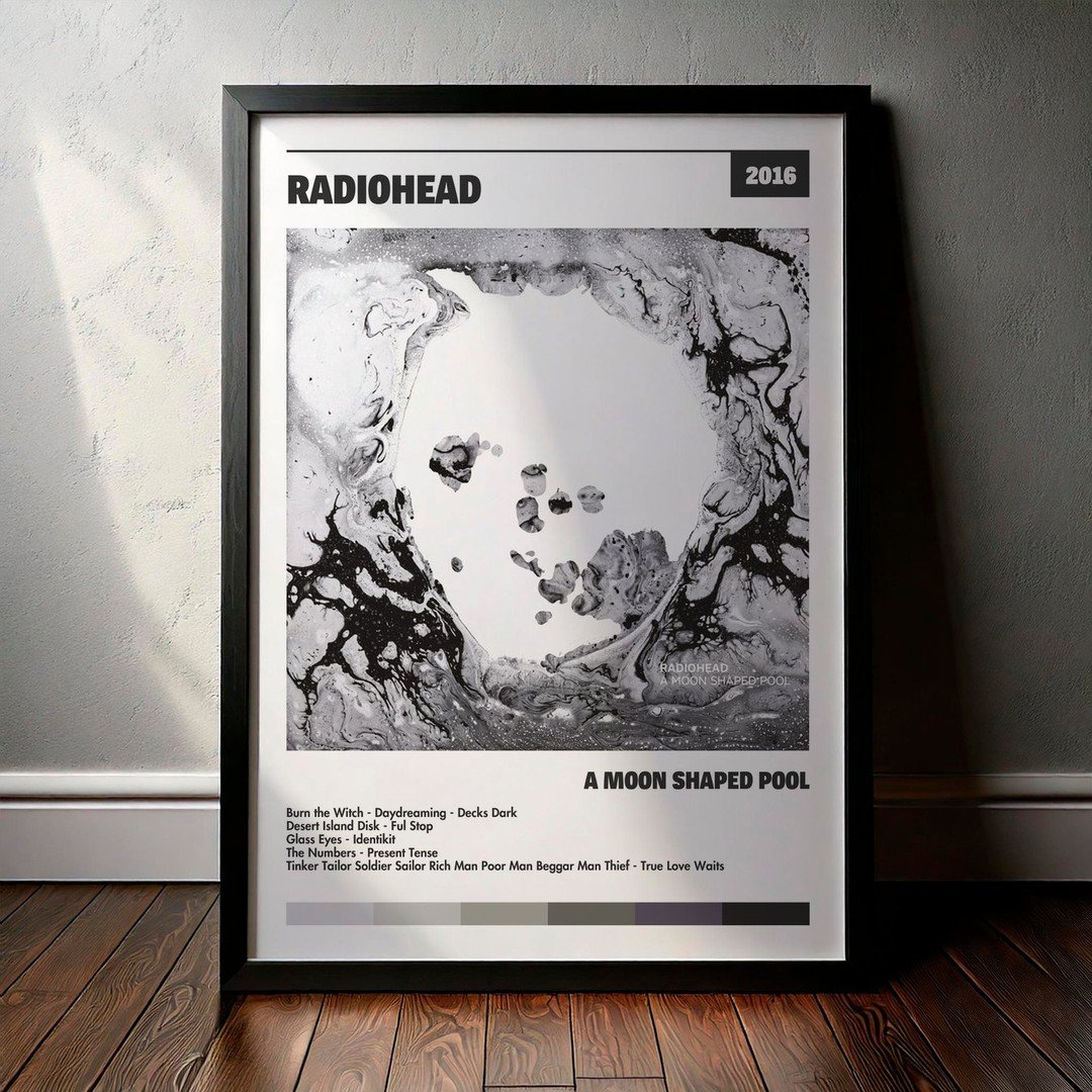 Nuestra colección de cuadros de Radiohead captura la esencia de sus álbumes más icónicos, presentados en un elegante estilo, en este caso te presentamos el de su disco A Moon Shaped Pool.