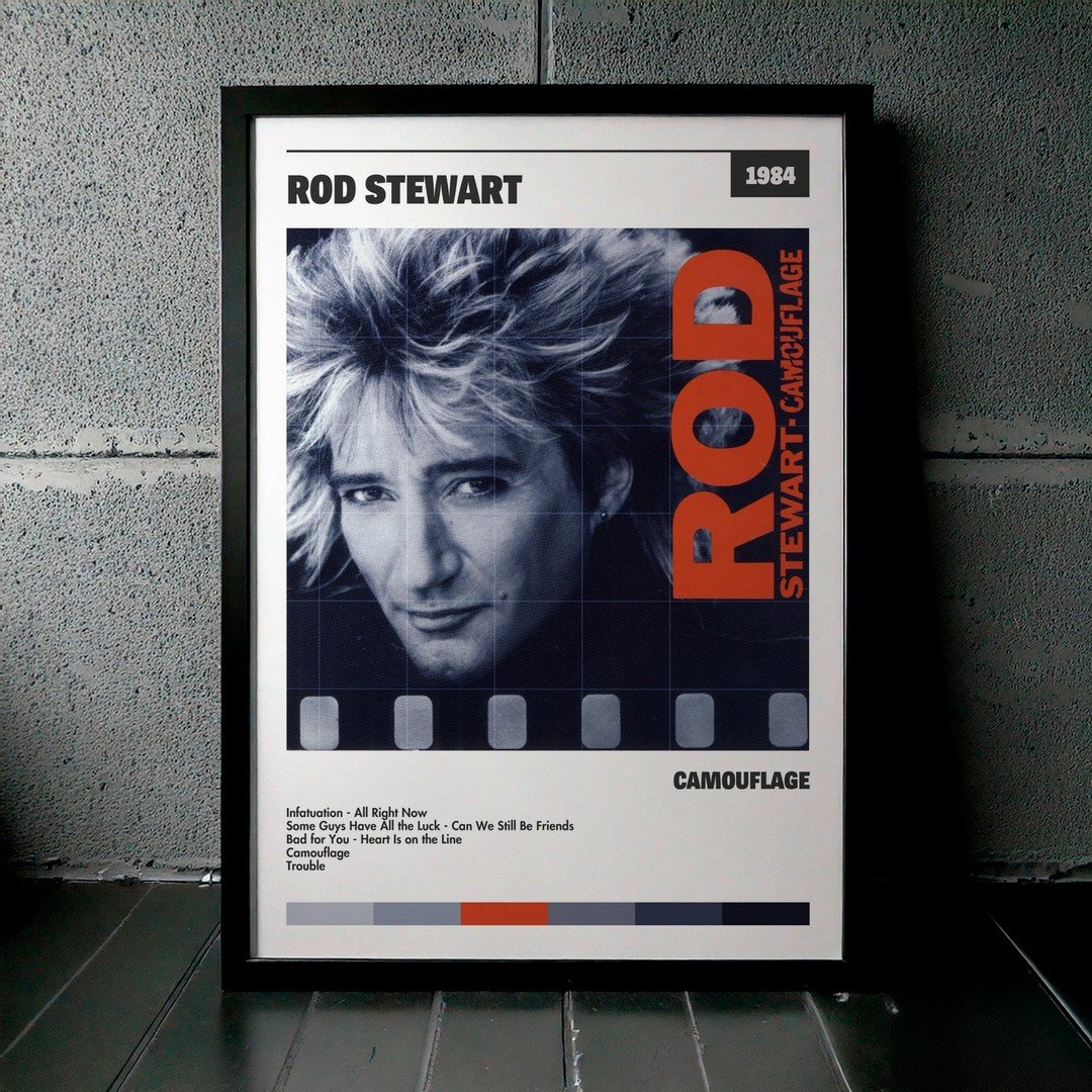 Nuestra colección de cuadros de Rod Stewart captura la esencia de sus álbumes más icónicos, presentados en un elegante estilo, en este caso te presentamos el de su disco Camouflage.