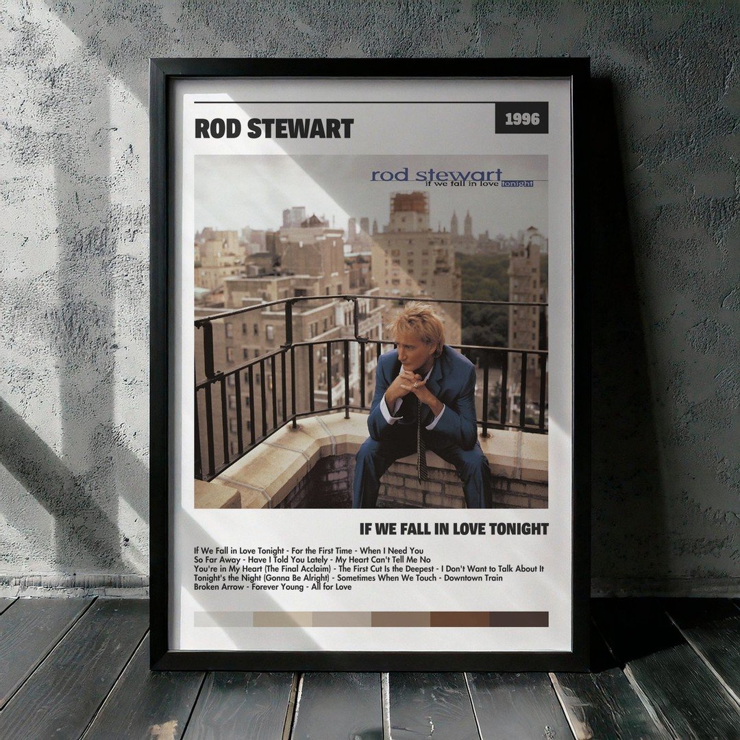 Nuestra colección de cuadros de Rod Stewart captura la esencia de sus álbumes más icónicos, presentados en un elegante estilo, en este caso te presentamos el de su disco If We Fall in Love Tonight.