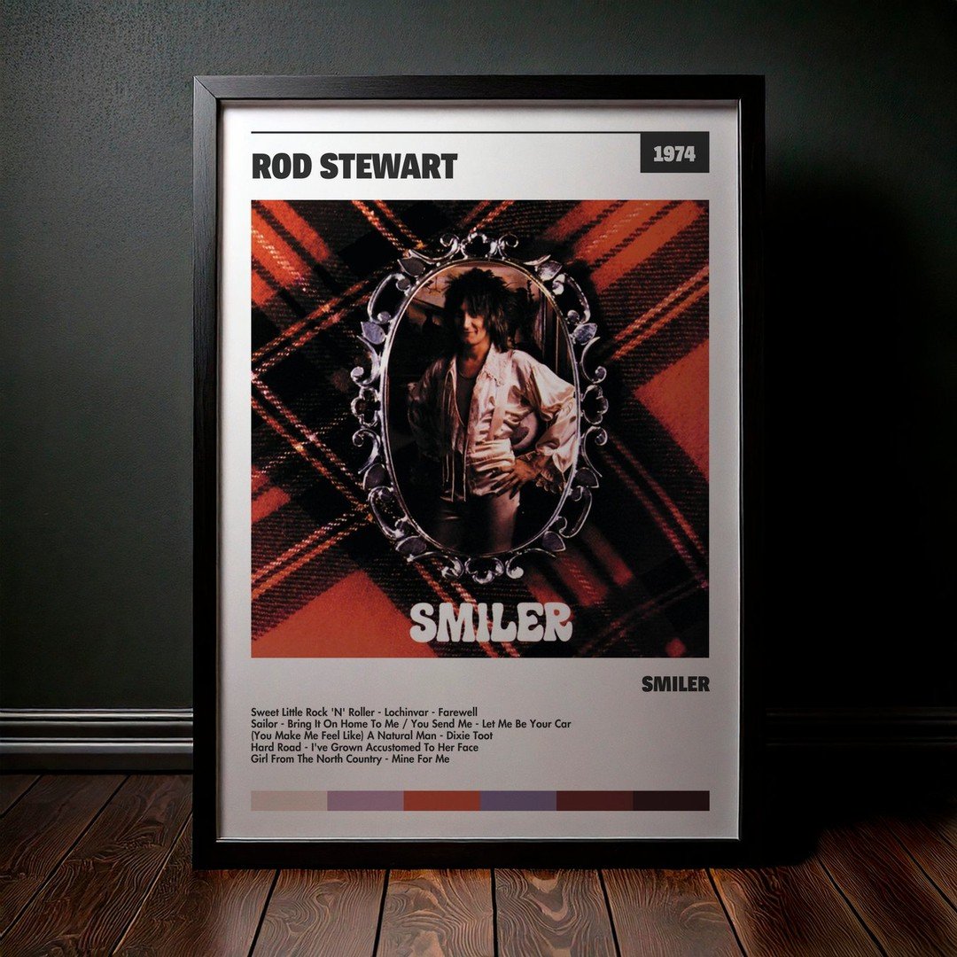 Nuestra colección de cuadros de Rod Stewart captura la esencia de sus álbumes más icónicos, presentados en un elegante estilo, en este caso te presentamos el de su disco Smiler.