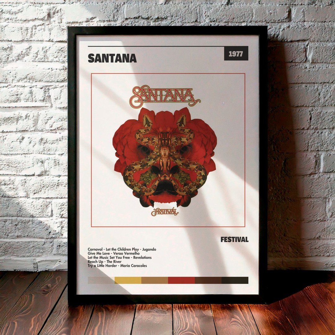 Nuestra colección de cuadros de Santana captura la esencia de sus álbumes más icónicos, presentados en un elegante estilo, en este caso te presentamos el de su disco Festival.
