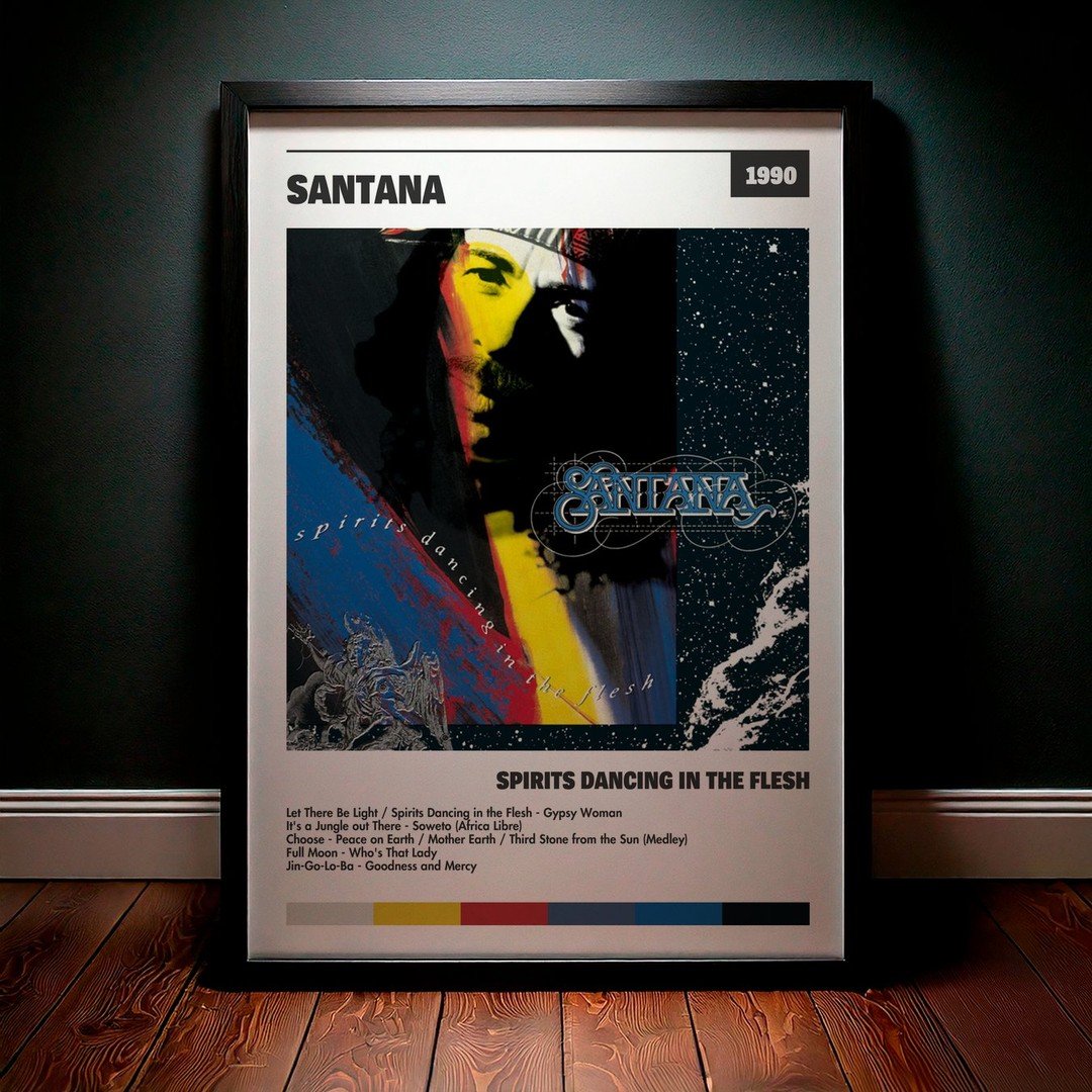 Nuestra colección de cuadros de Santana captura la esencia de sus álbumes más icónicos, presentados en un elegante estilo, en este caso te presentamos el de su disco Spirits Dancing In The Flesh.