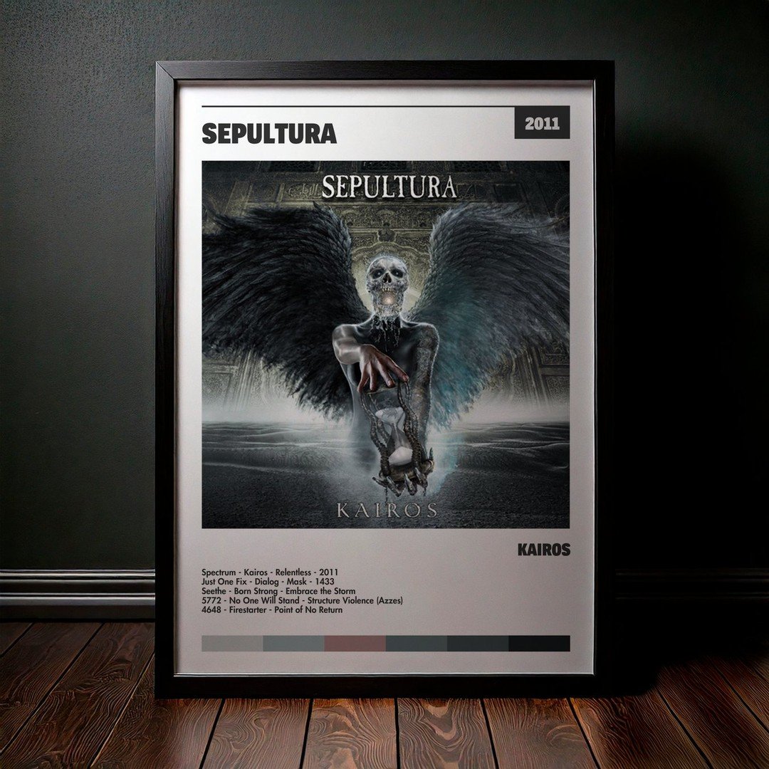 Nuestra colección de cuadros de Sepultura captura la esencia de sus álbumes más icónicos, presentados en un elegante estilo, en este caso te presentamos el de su disco Kairos.