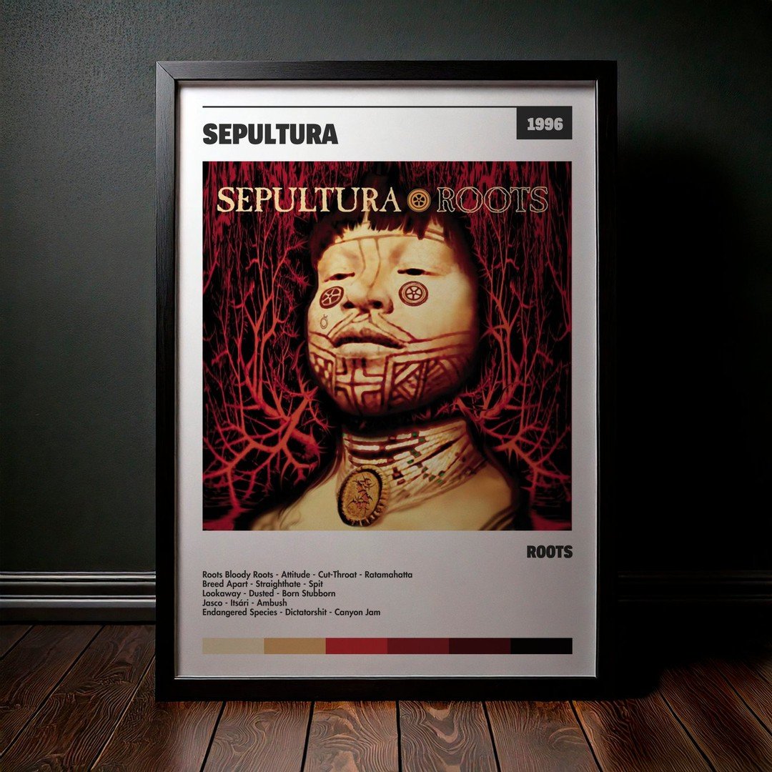 Nuestra colección de cuadros de Sepultura captura la esencia de sus álbumes más icónicos, presentados en un elegante estilo, en este caso te presentamos el de su disco Roots.