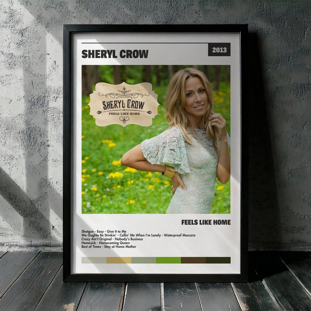 Nuestra colección de cuadros de Sheryl Crow captura la esencia de sus álbumes más icónicos, presentados en un elegante estilo, en este caso te presentamos el de su disco Feels Like Home.