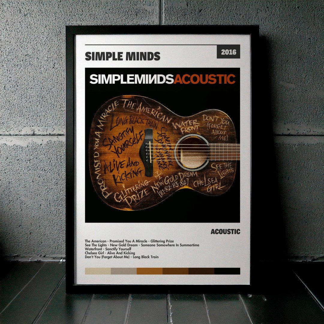 Nuestra colección de cuadros de Simple Minds captura la esencia de sus álbumes más icónicos, presentados en un elegante estilo, en este caso te presentamos el de su disco Acoustic.
