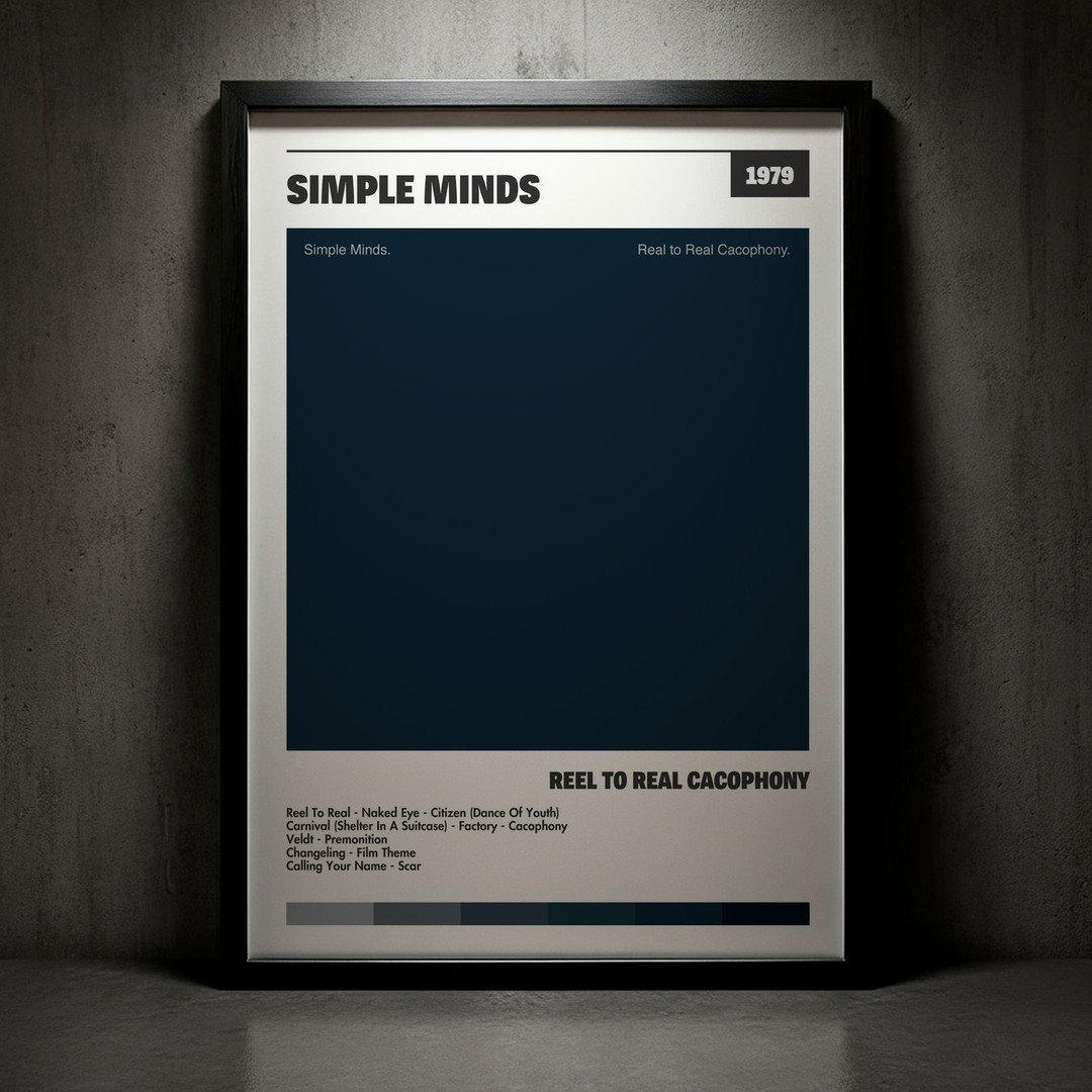 Nuestra colección de cuadros de Simple Minds captura la esencia de sus álbumes más icónicos, presentados en un elegante estilo, en este caso te presentamos el de su disco Reel To Real Cacophony.