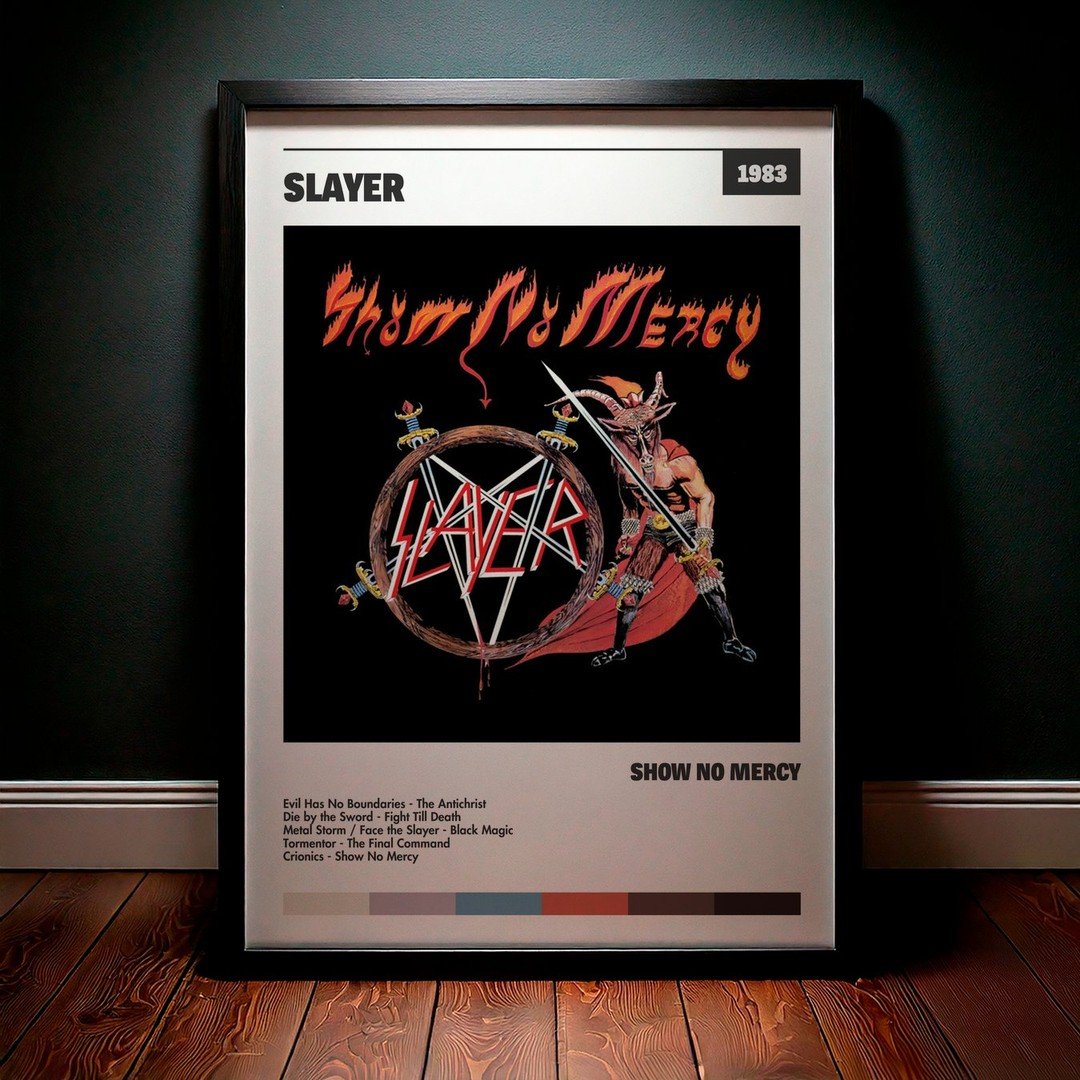 Nuestra colección de cuadros de Slayer captura la esencia de sus álbumes más icónicos, presentados en un elegante estilo, en este caso te presentamos el de su disco Show No Mercy.