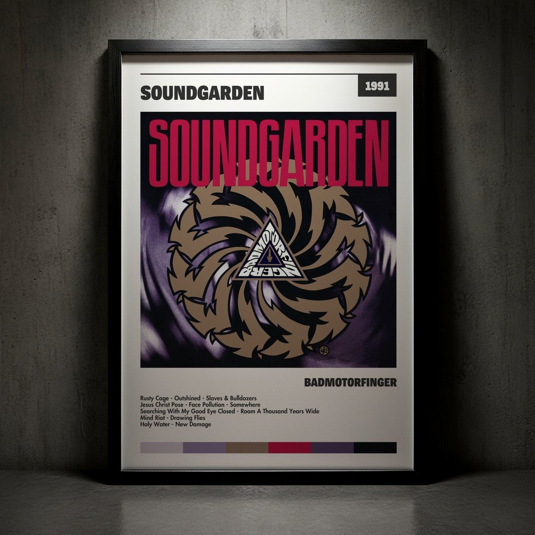 Nuestra colección de cuadros de Soundgarden captura la esencia de sus álbumes más icónicos, presentados en un elegante estilo, en este caso te presentamos el de su disco Badmotorfinger.