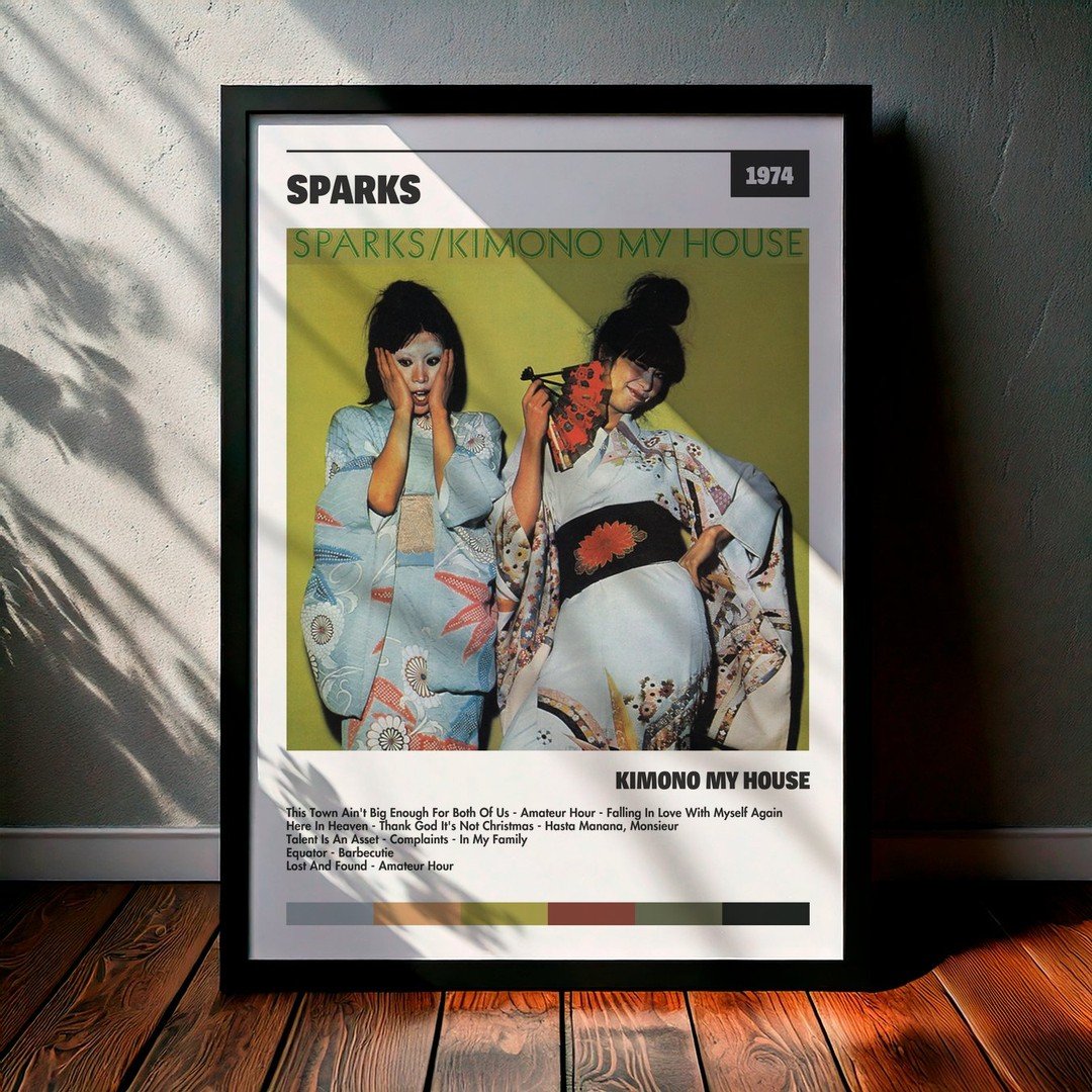 Nuestra colección de cuadros de Sparks captura la esencia de sus álbumes más icónicos, presentados en un elegante estilo, en este caso te presentamos el de su disco Kimono My House.
