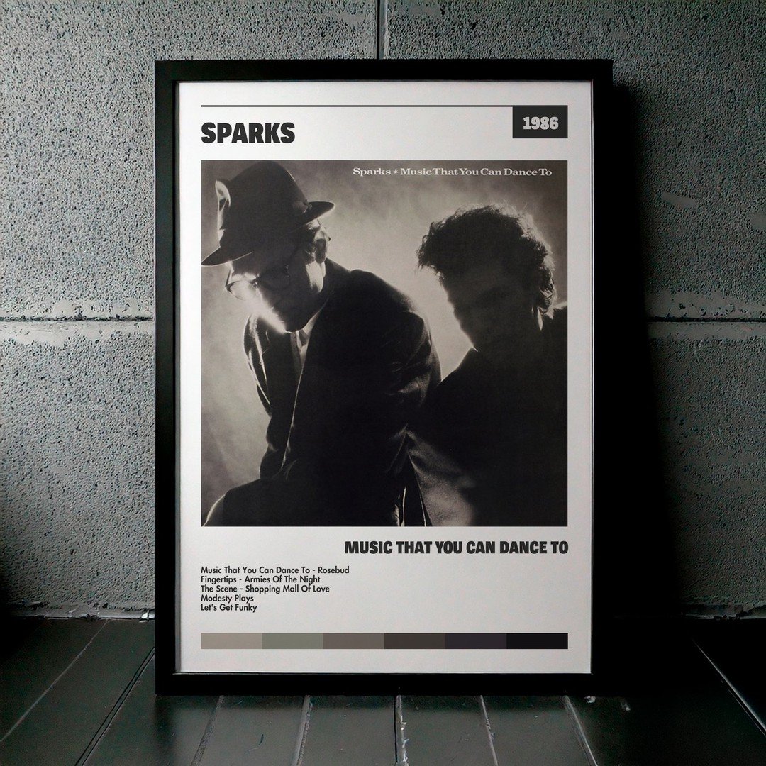 Nuestra colección de cuadros de Sparks captura la esencia de sus álbumes más icónicos, presentados en un elegante estilo, en este caso te presentamos el de su disco Music That You Can Dance To.