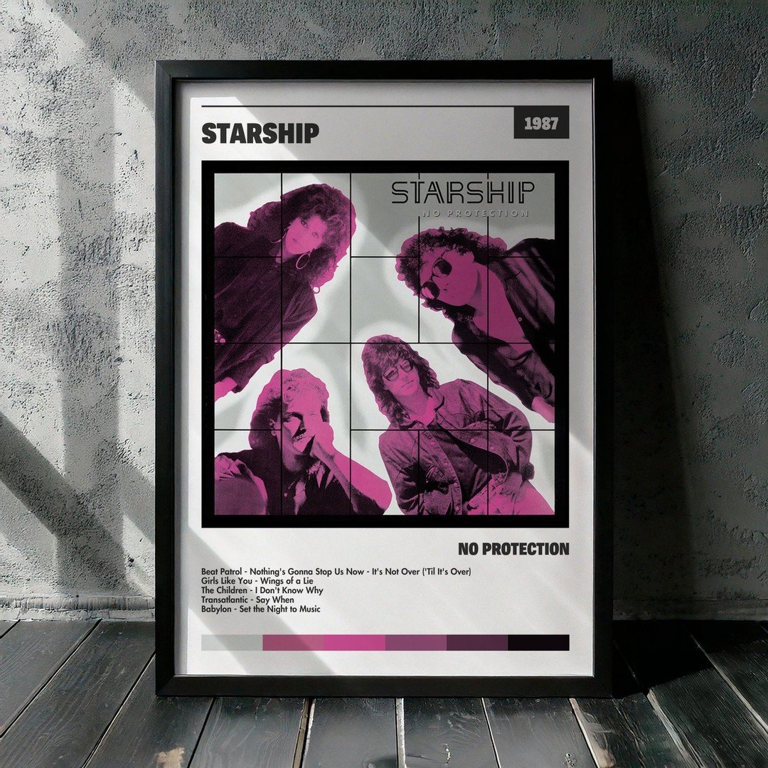 Nuestra colección de cuadros de Starship captura la esencia de sus álbumes más icónicos, presentados en un elegante estilo, en este caso te presentamos el de su disco No Protection.