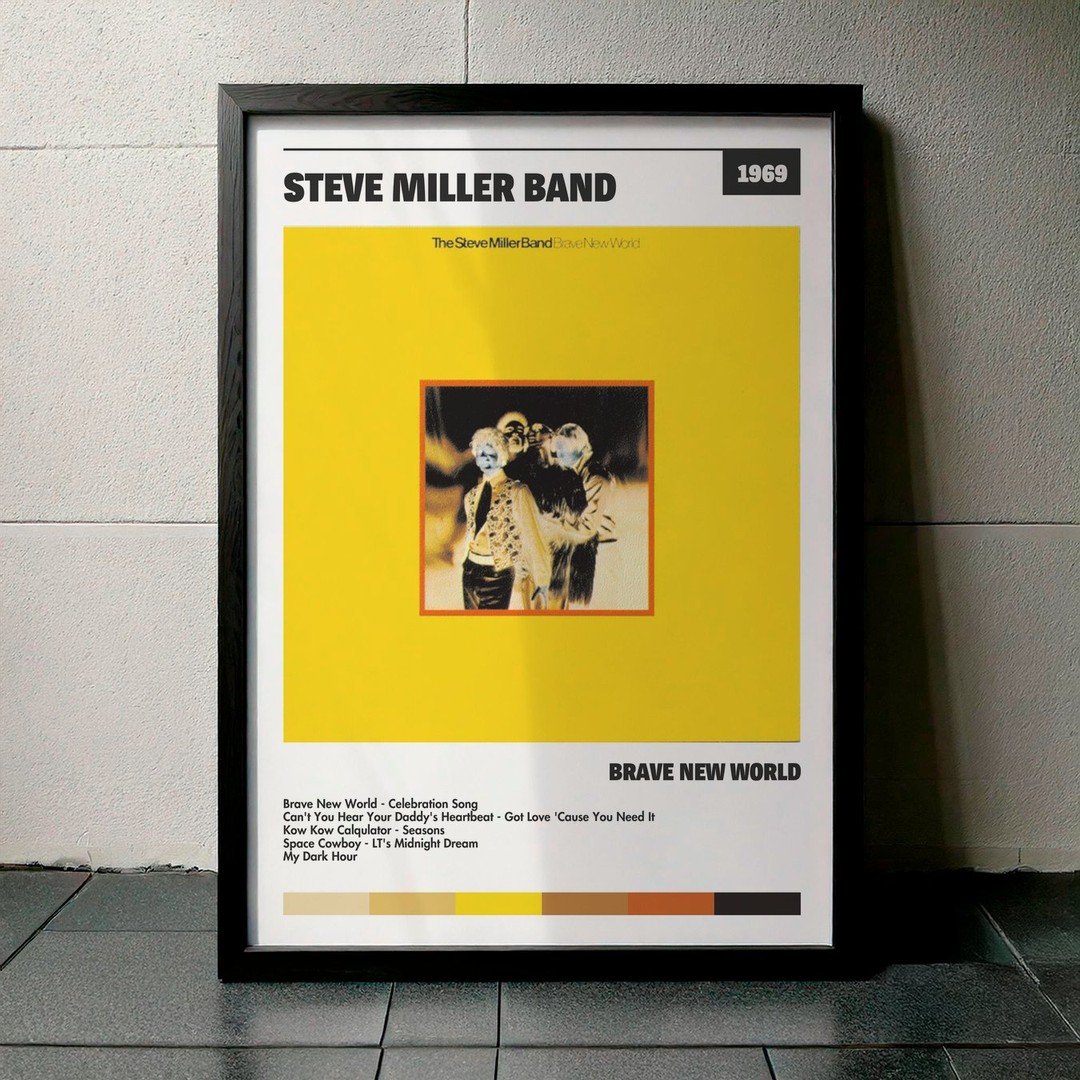 Nuestra colección de cuadros de Steve Miller Band captura la esencia de sus álbumes más icónicos, presentados en un elegante estilo, en este caso te presentamos el de su disco Brave New World.